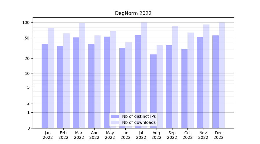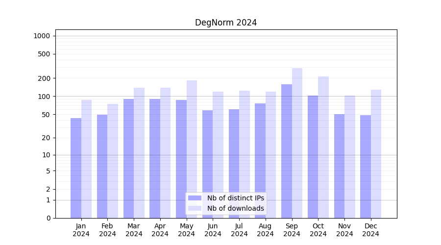 Number of downloads for software package DegNorm, year by year, from 2025 back to 2014 (years with no downloads are omitted):