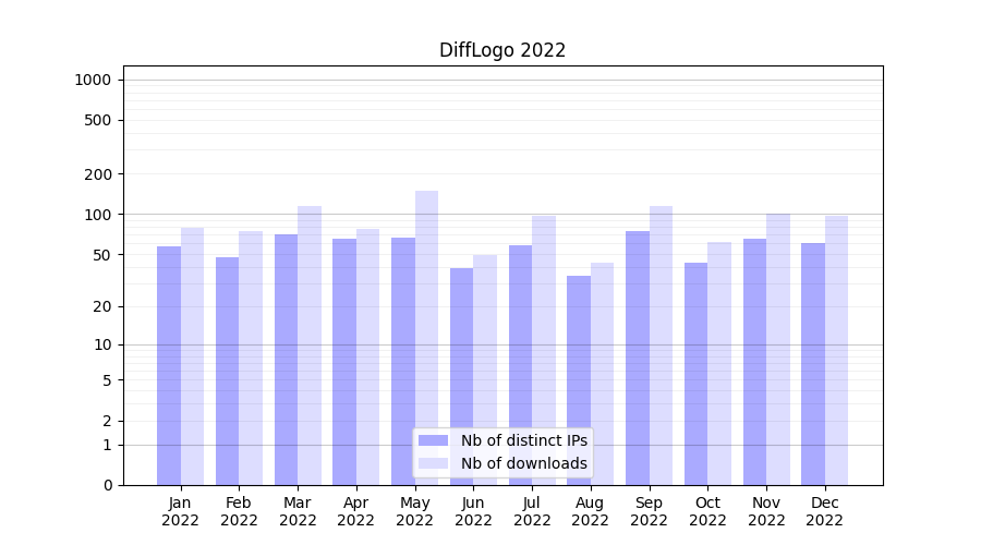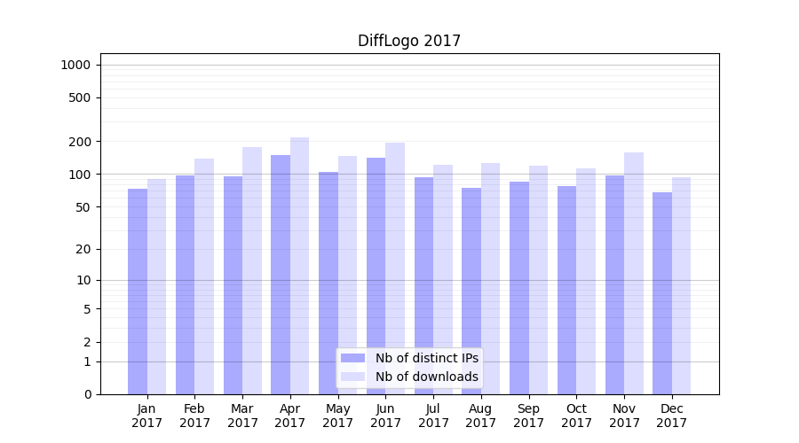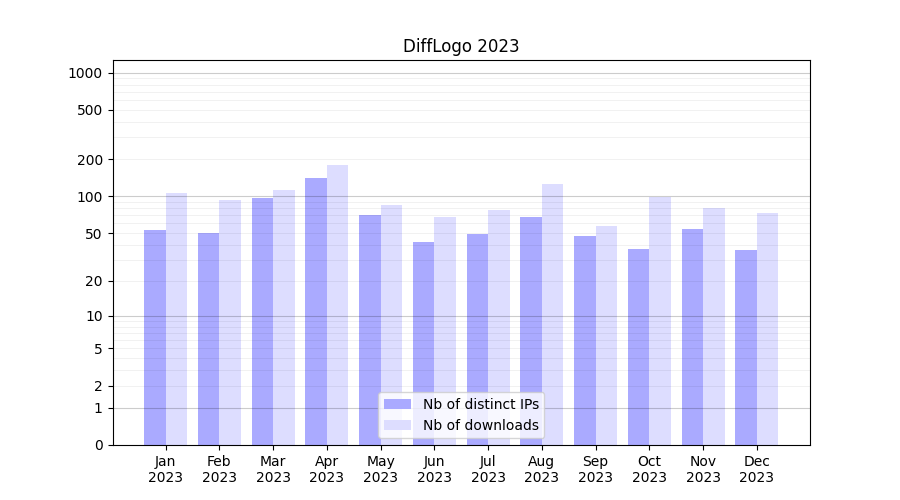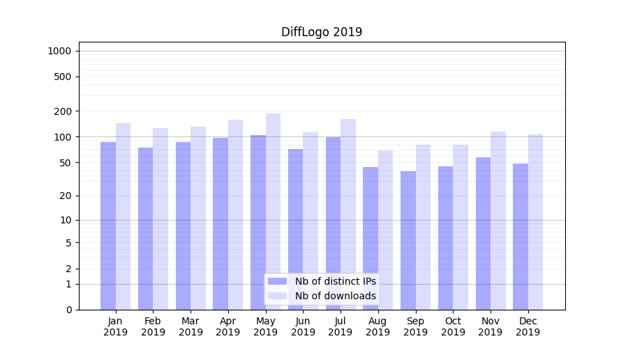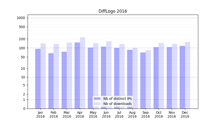 Number of downloads for software package DiffLogo, year by year, from 2025 back to 2014 (years with no downloads are omitted):