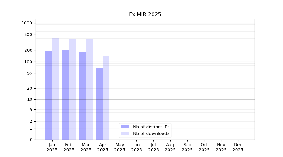 Number of downloads for software package ExiMiR, year by year, from 2025 back to 2014 (years with no downloads are omitted):