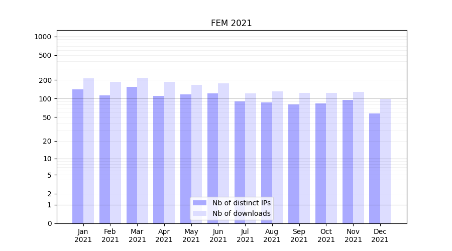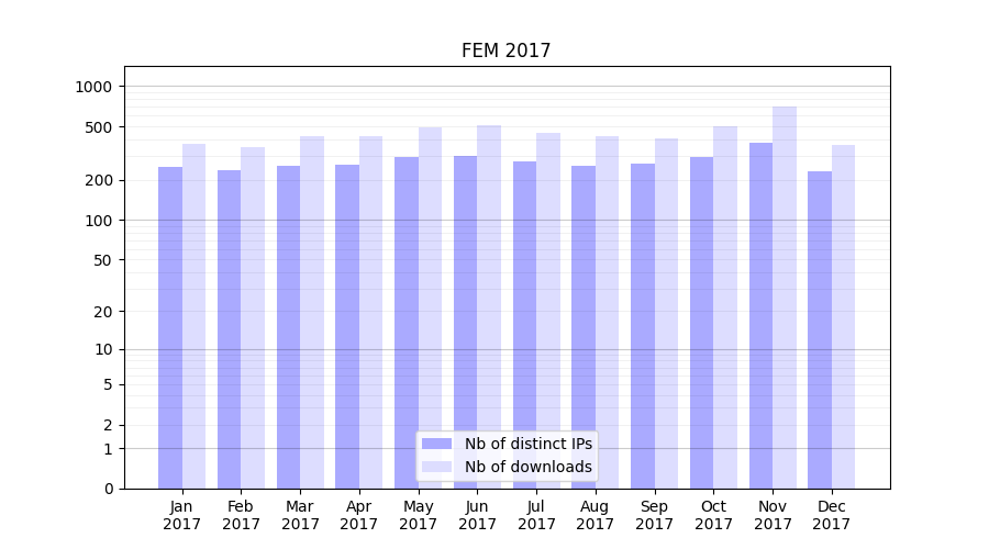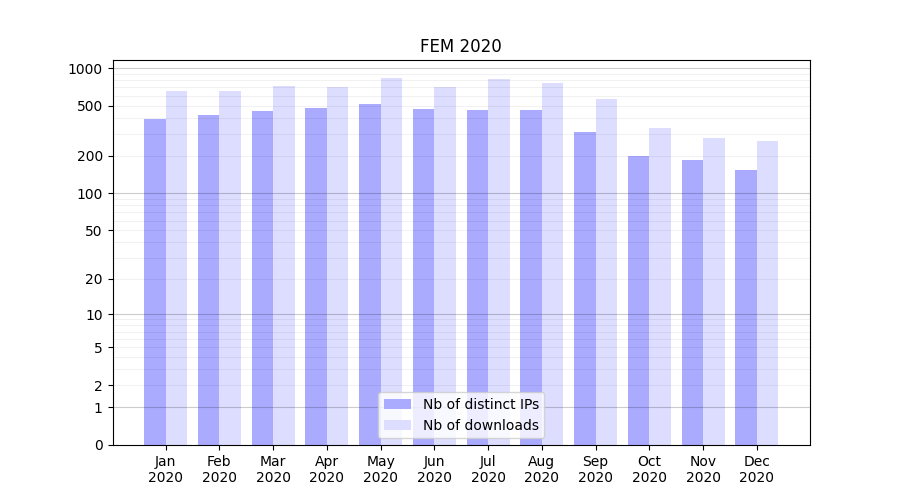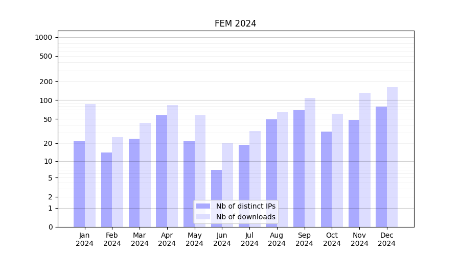 Number of downloads for software package FEM, year by year, from 2025 back to 2014 (years with no downloads are omitted):