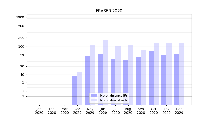 Number of downloads for software package FRASER, year by year, from 2025 back to 2014 (years with no downloads are omitted):