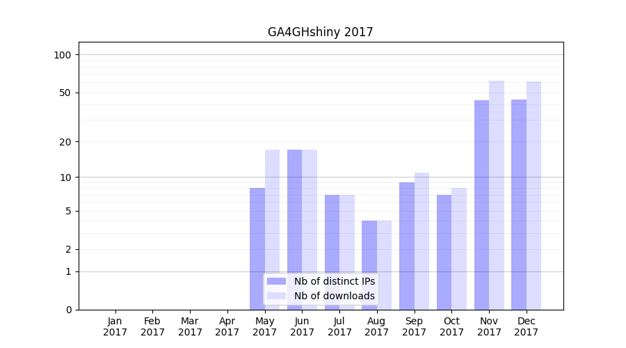 Number of downloads for software package GA4GHshiny, year by year, from 2025 back to 2014 (years with no downloads are omitted):