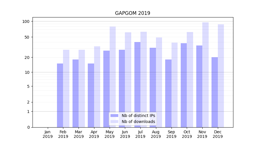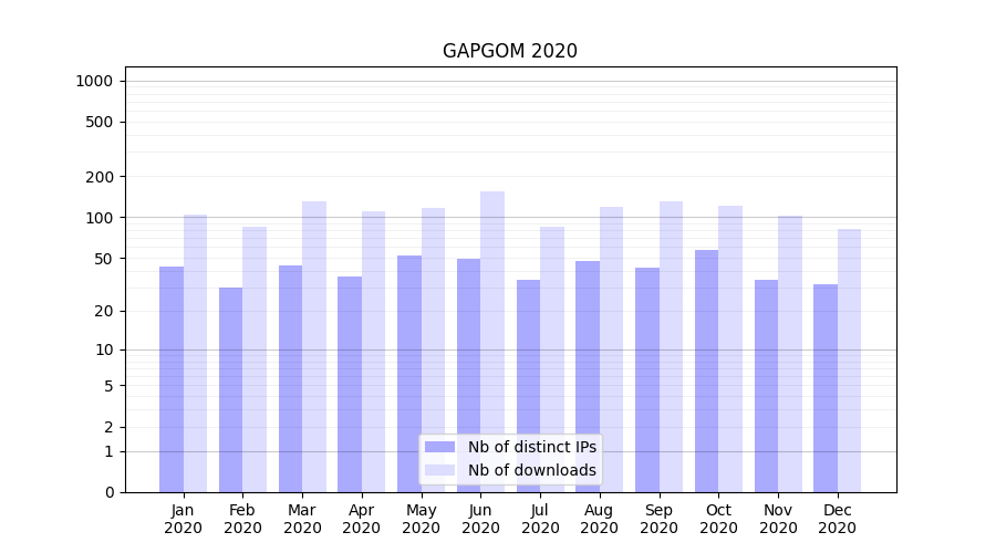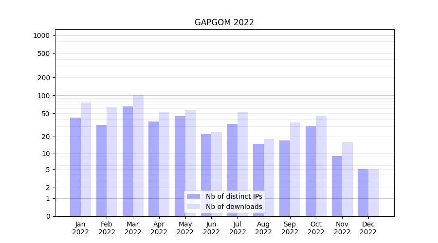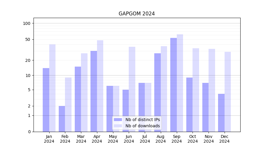 Number of downloads for software package GAPGOM, year by year, from 2025 back to 2014 (years with no downloads are omitted):