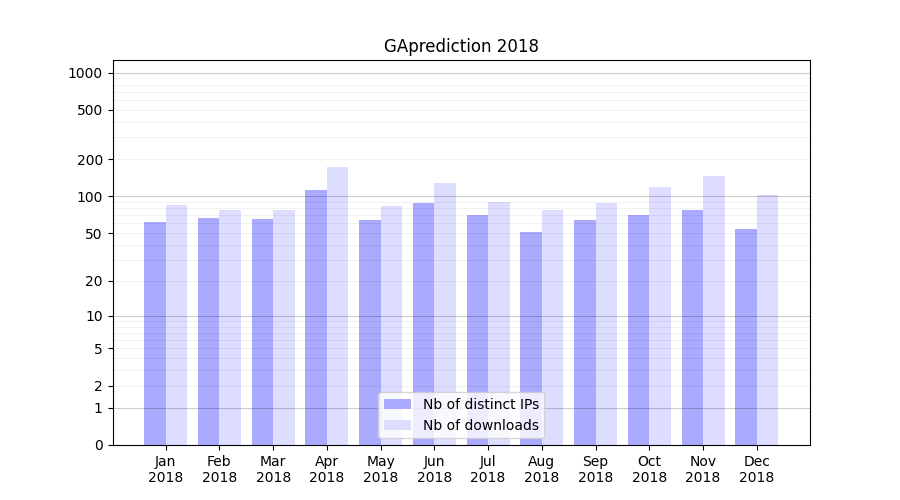 Number of downloads for software package GAprediction, year by year, from 2025 back to 2014 (years with no downloads are omitted):