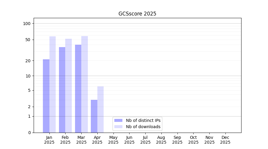 Number of downloads for software package GCSscore, year by year, from 2025 back to 2014 (years with no downloads are omitted):