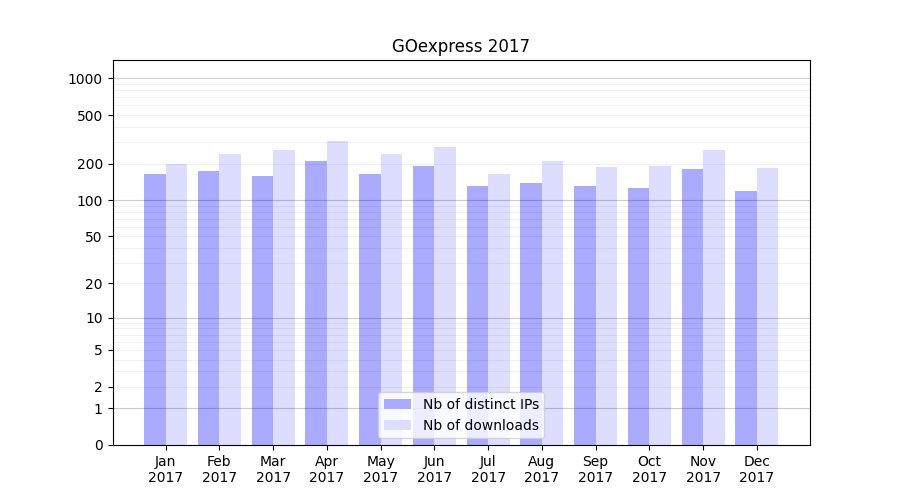 Number of downloads for software package GOexpress, year by year, from 2025 back to 2014 (years with no downloads are omitted):