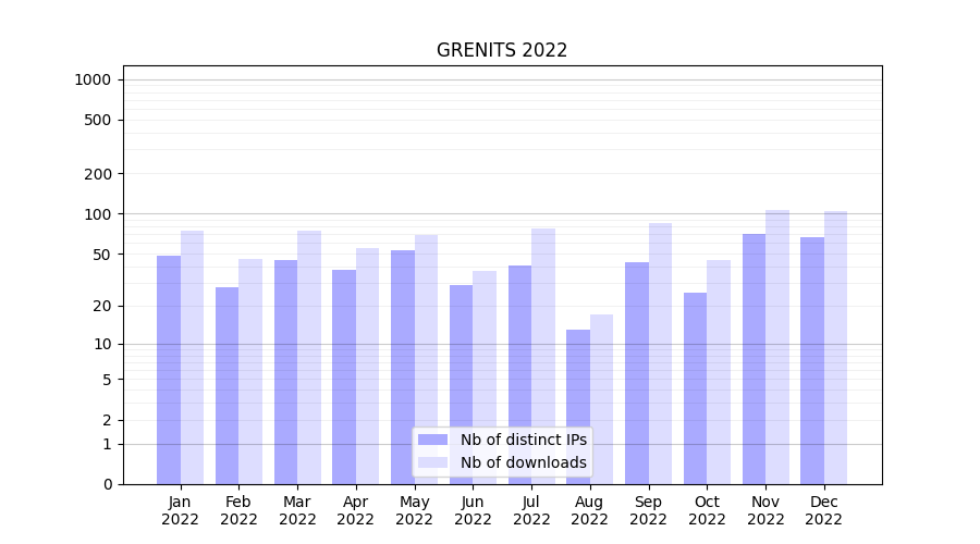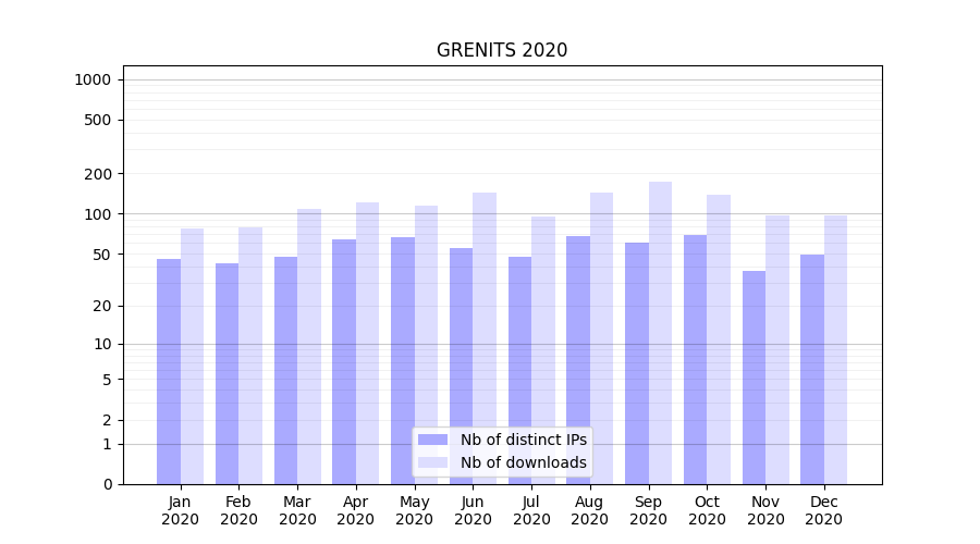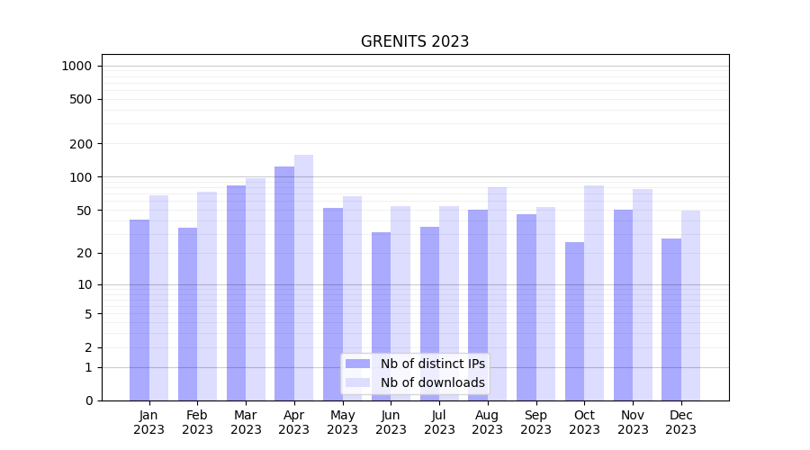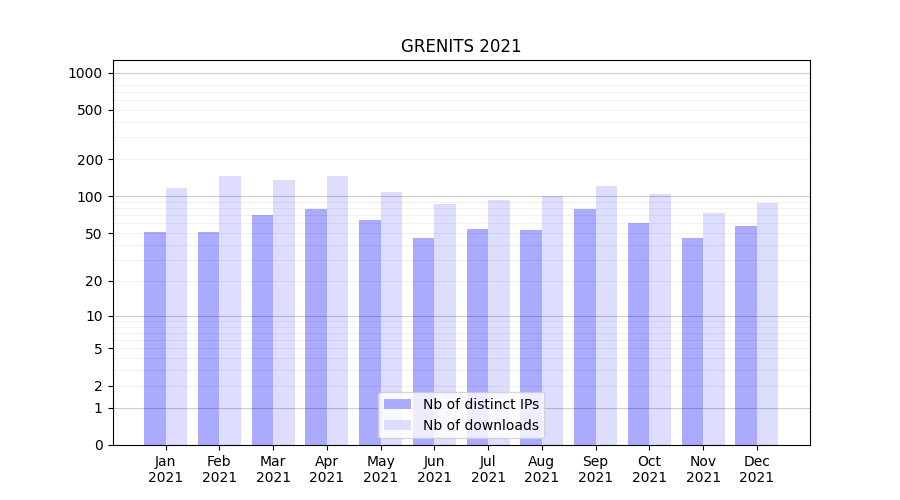 Number of downloads for software package GRENITS, year by year, from 2025 back to 2014 (years with no downloads are omitted):
