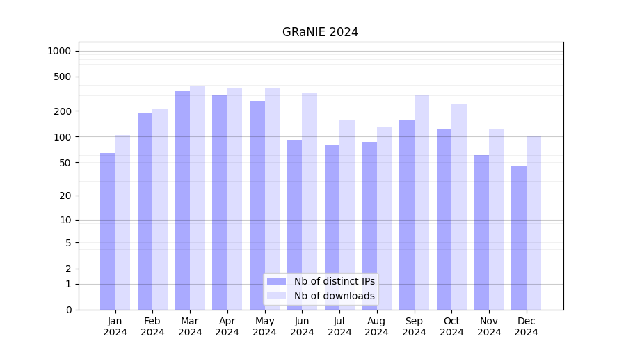 Number of downloads for software package GRaNIE, year by year, from 2025 back to 2014 (years with no downloads are omitted):