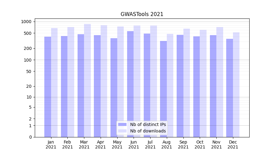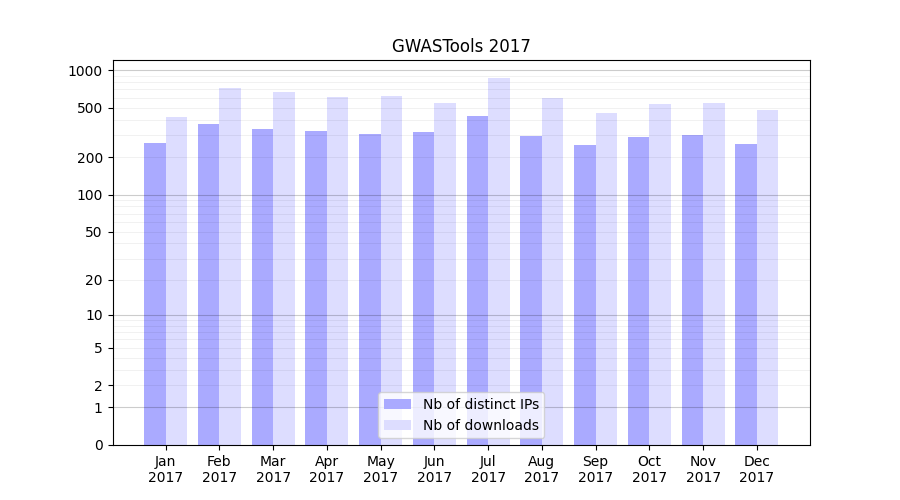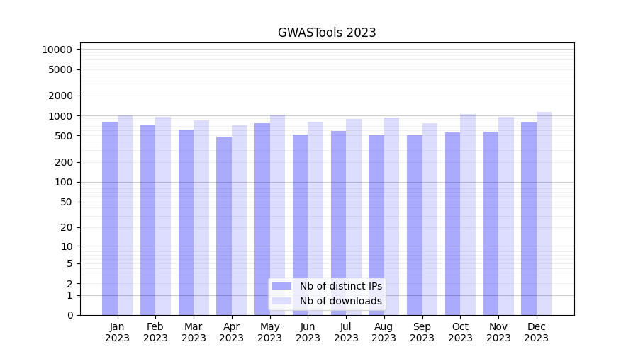Number of downloads for software package GWASTools, year by year, from 2025 back to 2014 (years with no downloads are omitted):