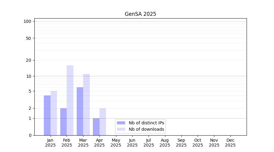 Number of downloads for software package GenSA, year by year, from 2025 back to 2014 (years with no downloads are omitted):