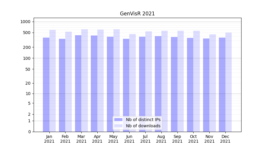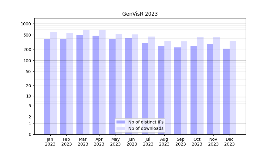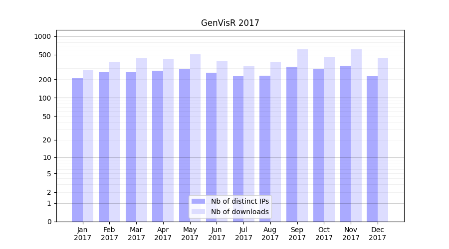 Number of downloads for software package GenVisR, year by year, from 2025 back to 2014 (years with no downloads are omitted):
