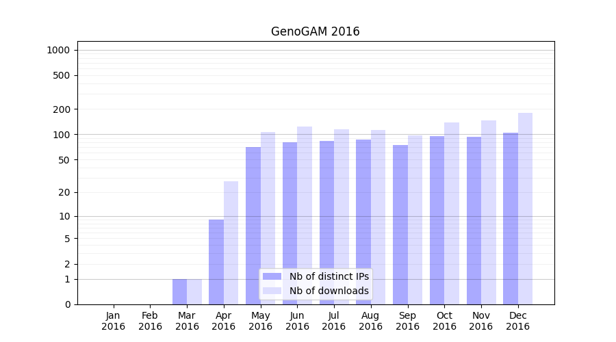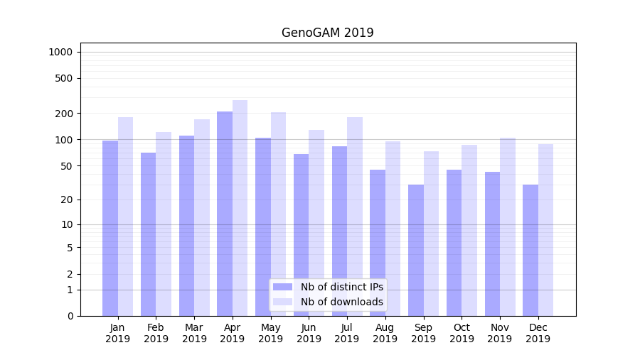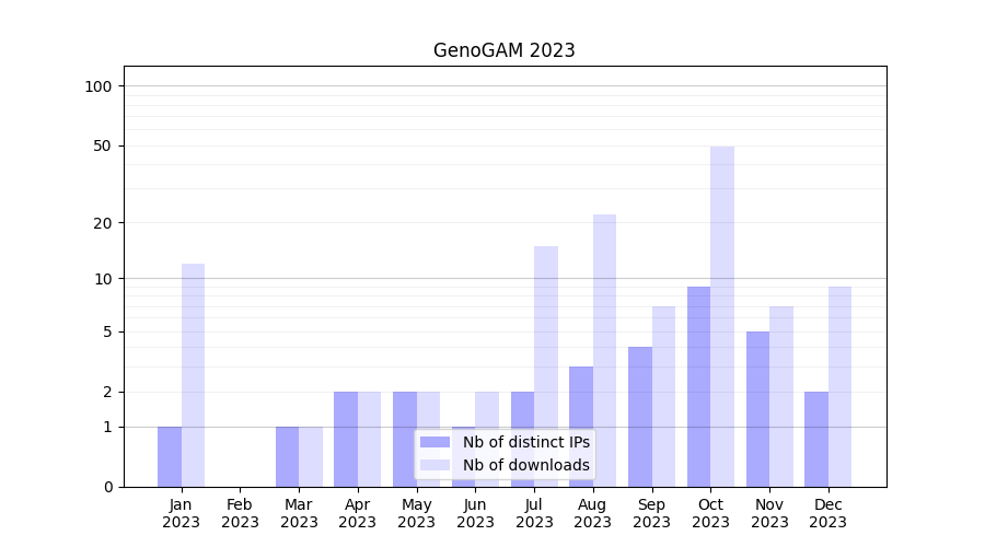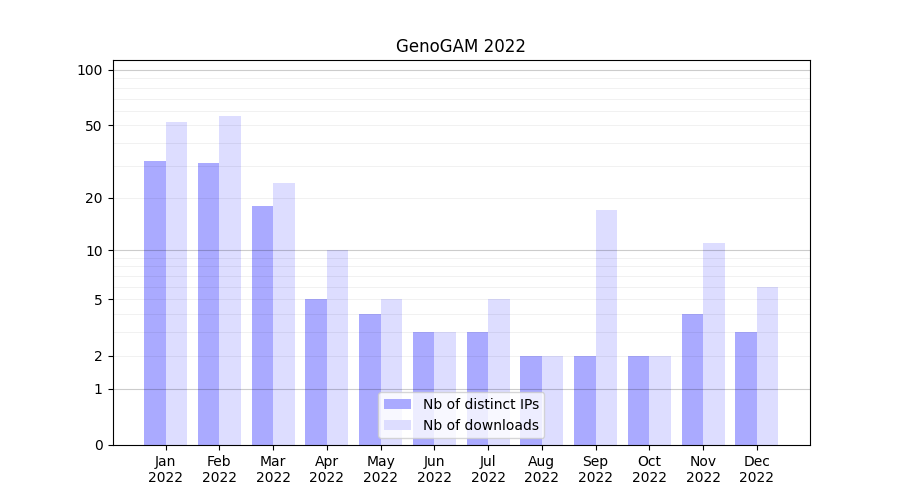 Number of downloads for software package GenoGAM, year by year, from 2025 back to 2014 (years with no downloads are omitted):