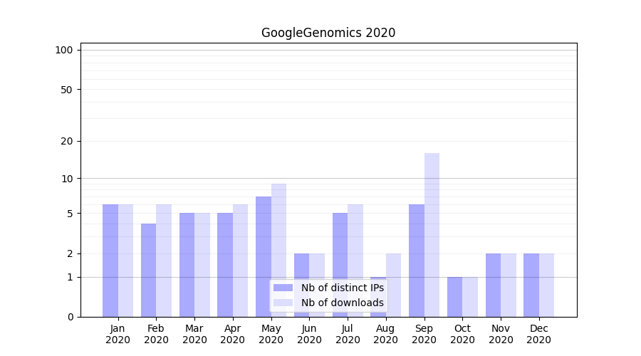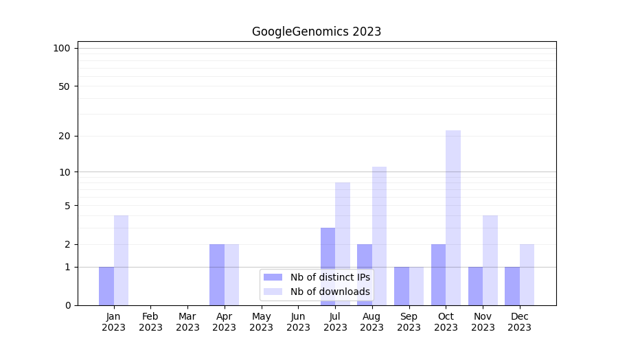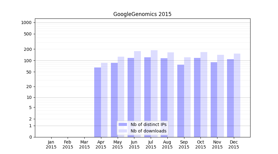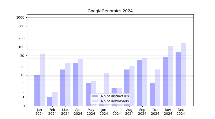 Number of downloads for software package GoogleGenomics, year by year, from 2025 back to 2014 (years with no downloads are omitted):