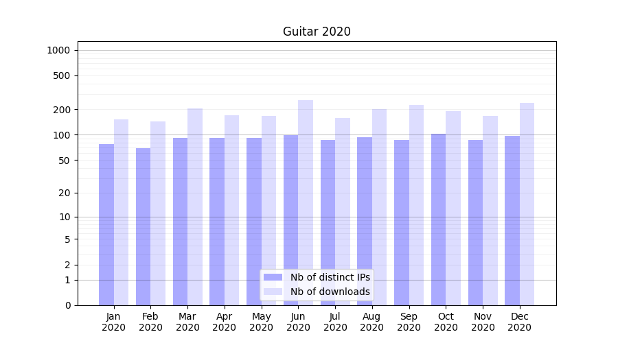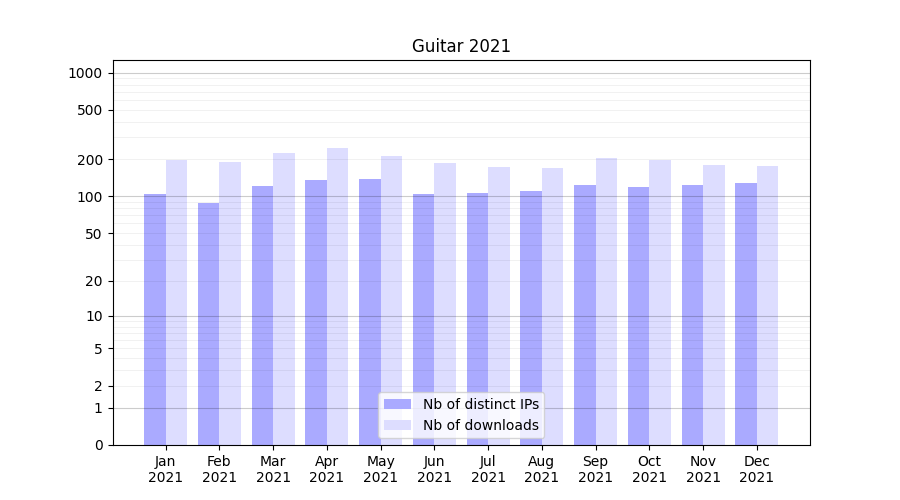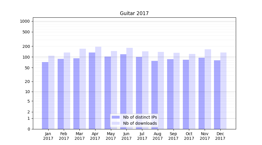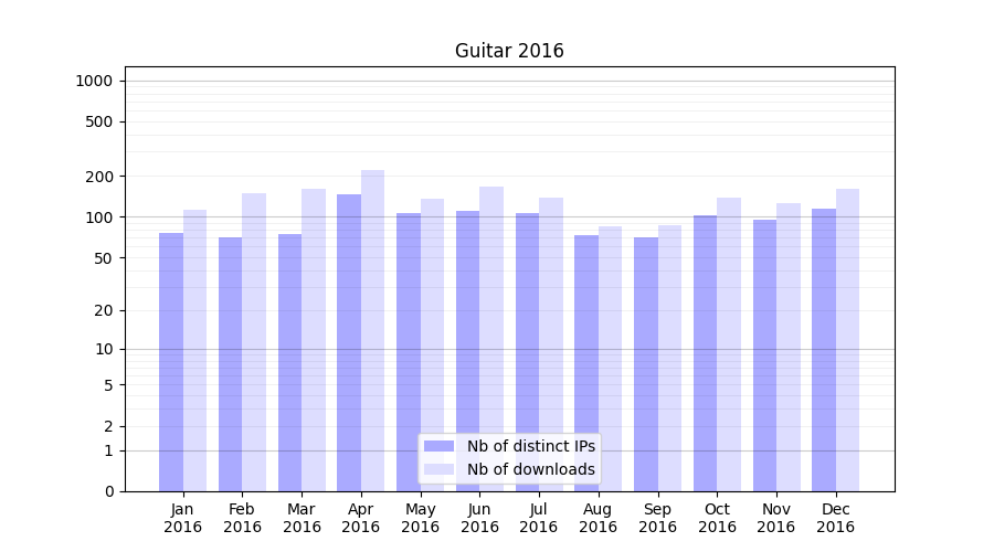 Number of downloads for software package Guitar, year by year, from 2025 back to 2014 (years with no downloads are omitted):