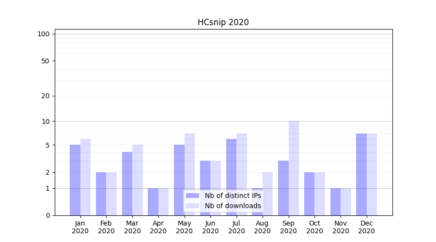 Number of downloads for software package HCsnip, year by year, from 2025 back to 2014 (years with no downloads are omitted):
