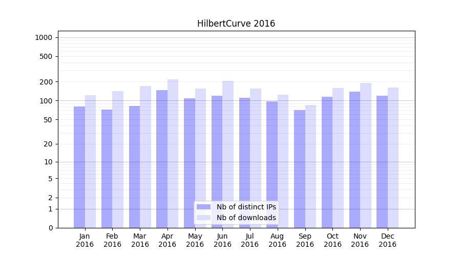 Number of downloads for software package HilbertCurve, year by year, from 2025 back to 2014 (years with no downloads are omitted):