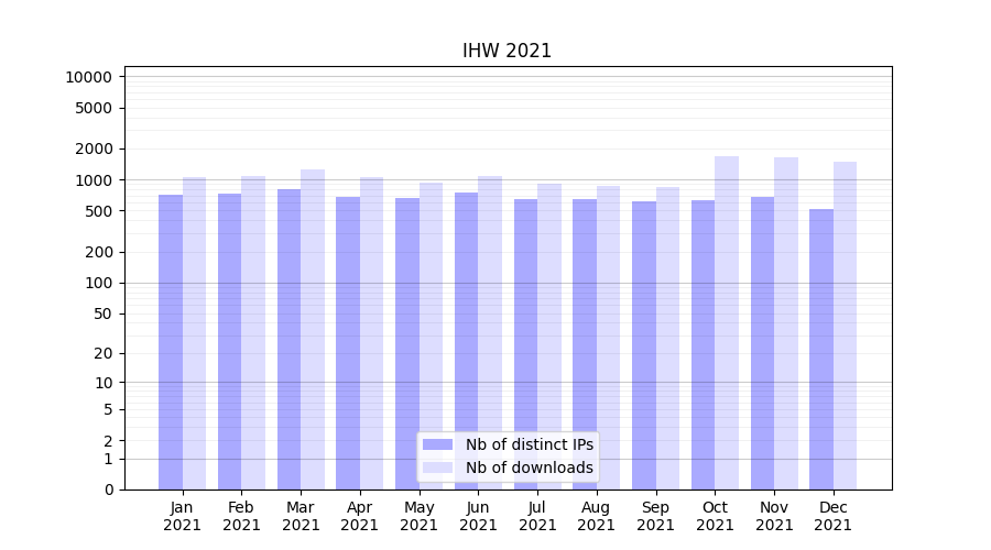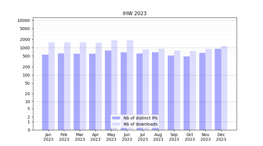 Number of downloads for software package IHW, year by year, from 2025 back to 2014 (years with no downloads are omitted):
