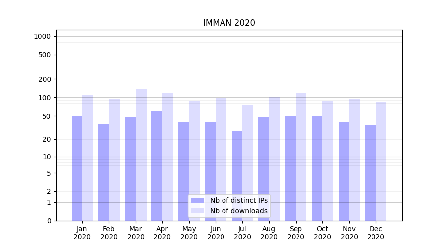 Number of downloads for software package IMMAN, year by year, from 2025 back to 2014 (years with no downloads are omitted):