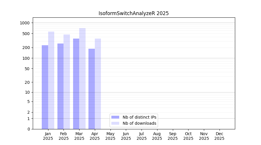 Number of downloads for software package IsoformSwitchAnalyzeR, year by year, from 2025 back to 2014 (years with no downloads are omitted):