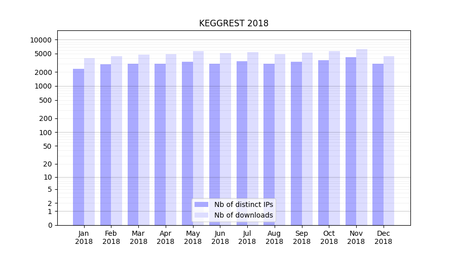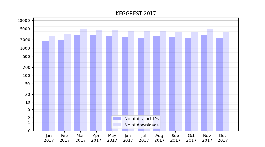 Number of downloads for software package KEGGREST, year by year, from 2025 back to 2014 (years with no downloads are omitted):