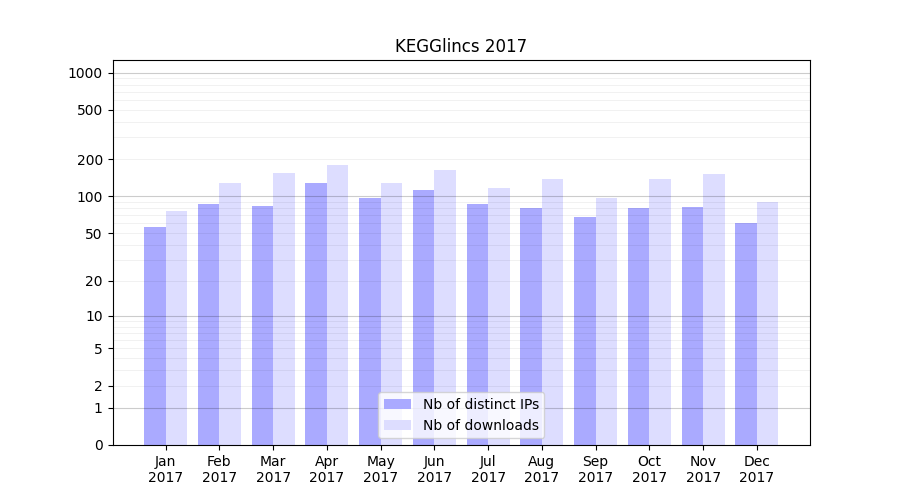 Number of downloads for software package KEGGlincs, year by year, from 2025 back to 2014 (years with no downloads are omitted):