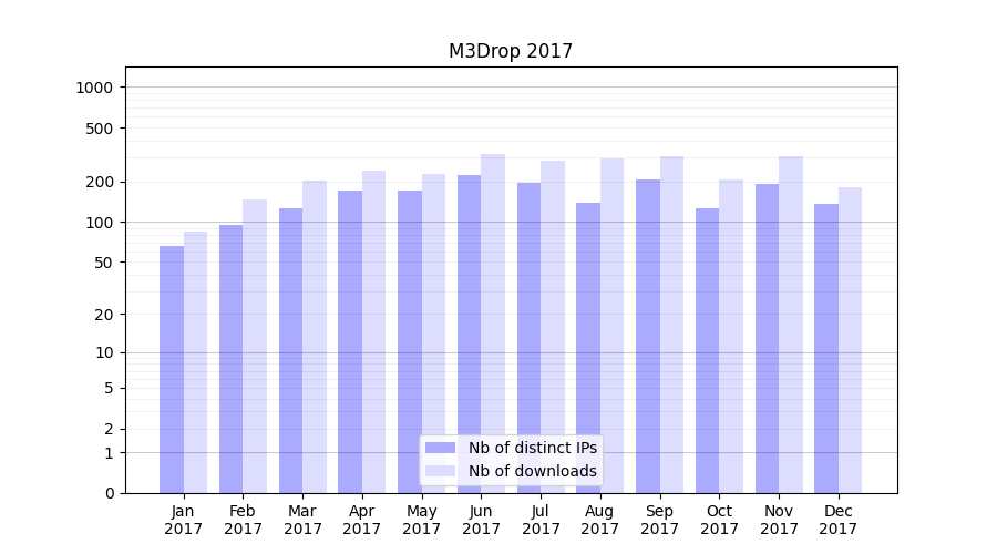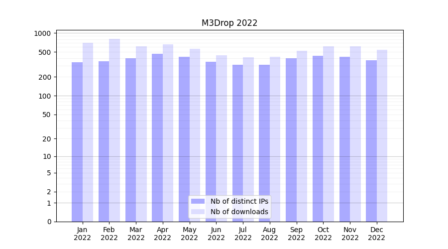 Number of downloads for software package M3Drop, year by year, from 2025 back to 2014 (years with no downloads are omitted):