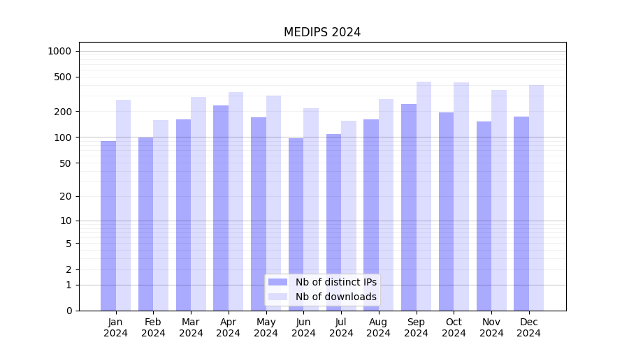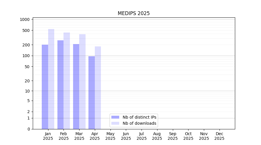 Number of downloads for software package MEDIPS, year by year, from 2025 back to 2014 (years with no downloads are omitted):