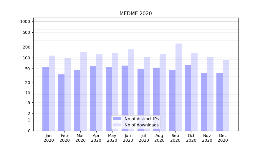 Number of downloads for software package MEDME, year by year, from 2025 back to 2014 (years with no downloads are omitted):
