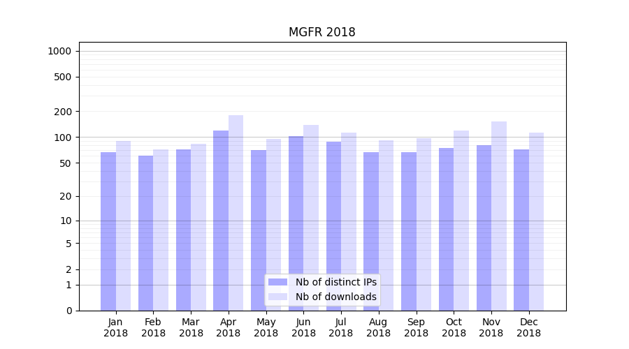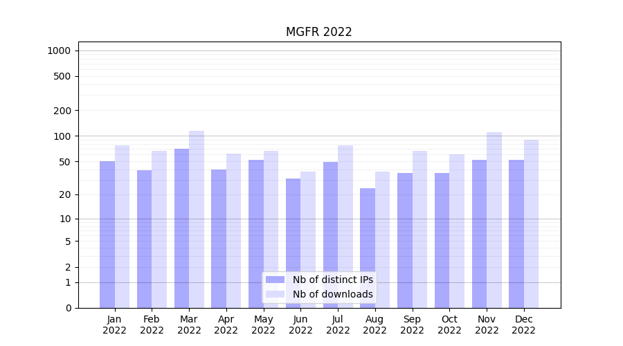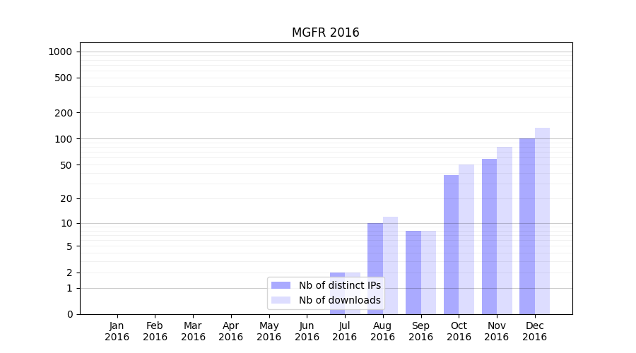 Number of downloads for software package MGFR, year by year, from 2025 back to 2014 (years with no downloads are omitted):
