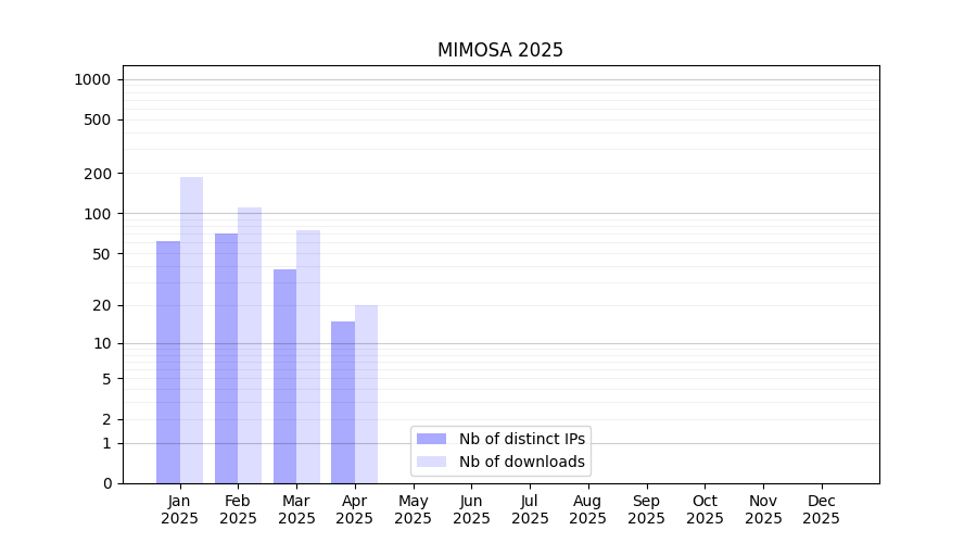 Number of downloads for software package MIMOSA, year by year, from 2025 back to 2014 (years with no downloads are omitted):