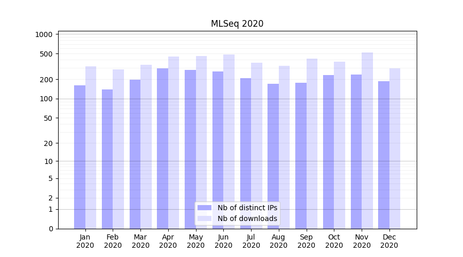 Number of downloads for software package MLSeq, year by year, from 2025 back to 2014 (years with no downloads are omitted):