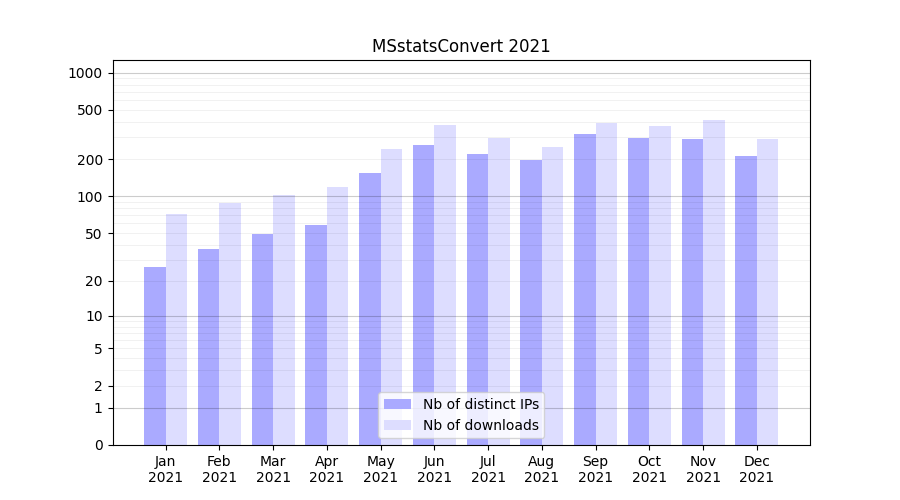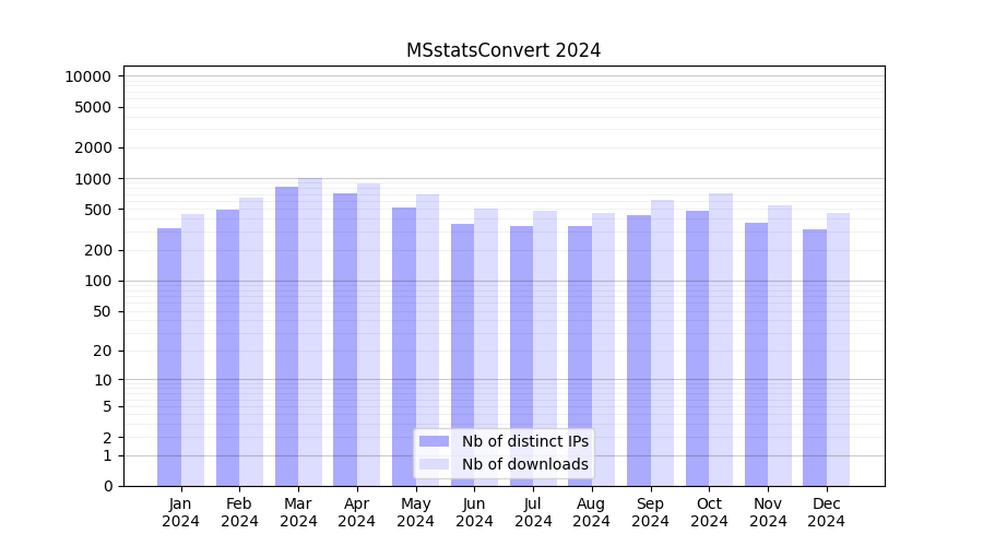 Number of downloads for software package MSstatsConvert, year by year, from 2025 back to 2014 (years with no downloads are omitted):