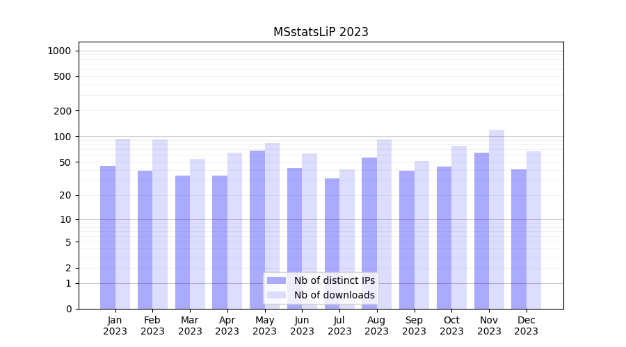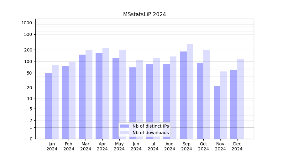 Number of downloads for software package MSstatsLiP, year by year, from 2025 back to 2014 (years with no downloads are omitted):
