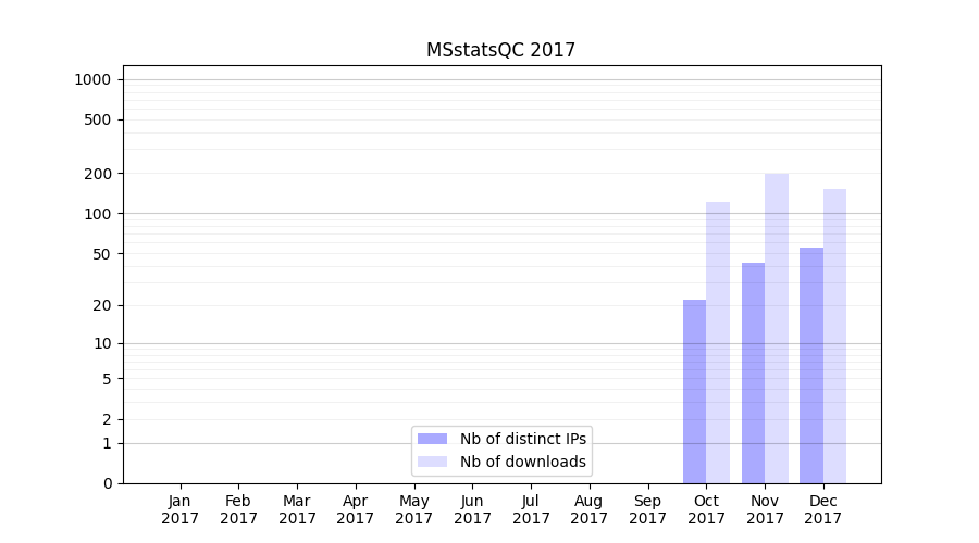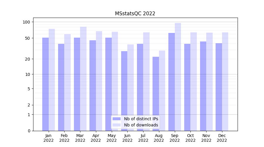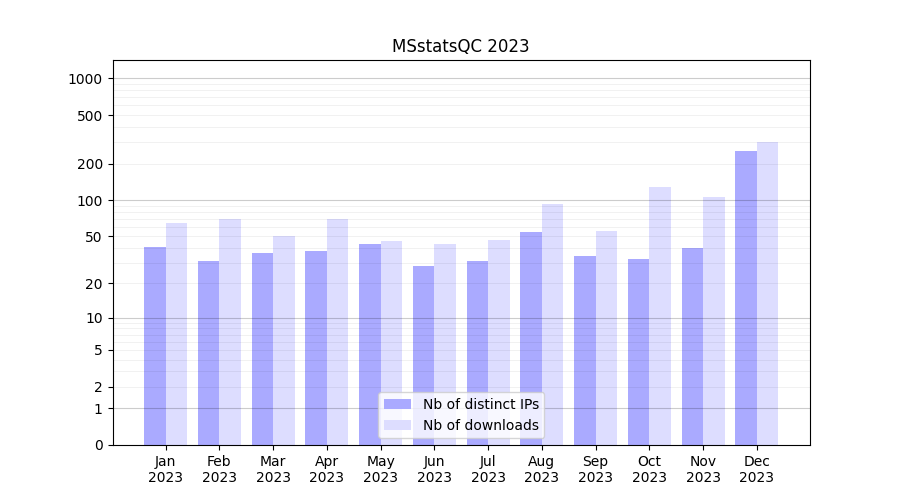 Number of downloads for software package MSstatsQC, year by year, from 2025 back to 2014 (years with no downloads are omitted):