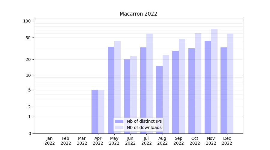 Number of downloads for software package Macarron, year by year, from 2025 back to 2014 (years with no downloads are omitted):