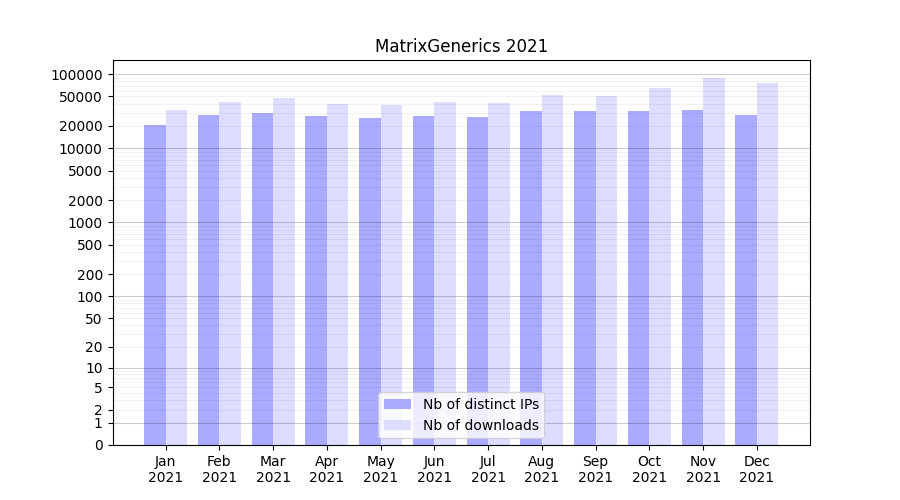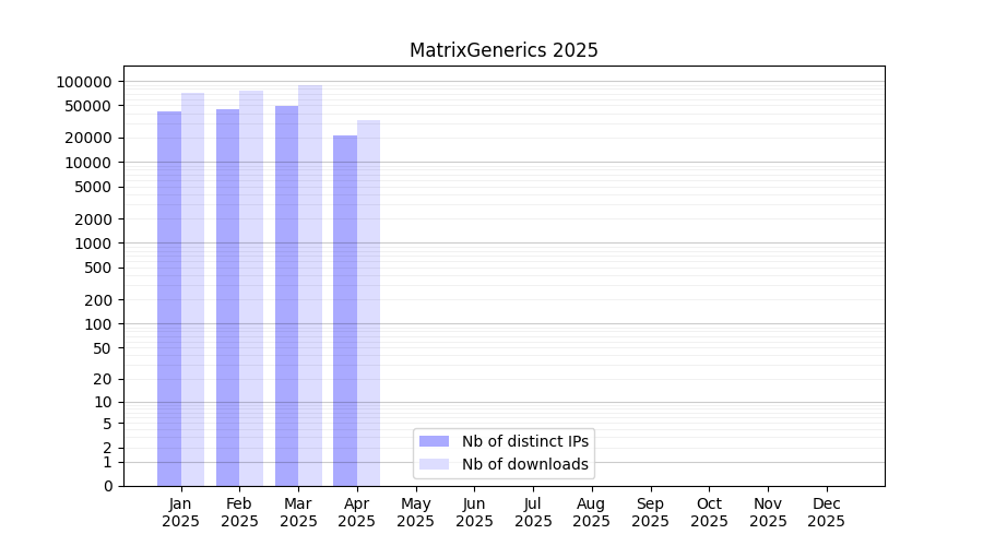 Number of downloads for software package MatrixGenerics, year by year, from 2025 back to 2014 (years with no downloads are omitted):
