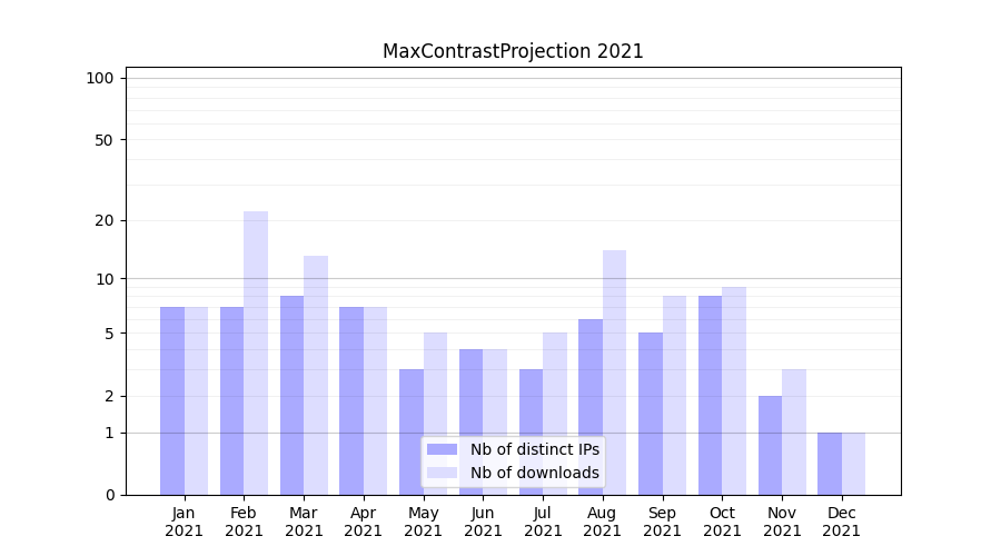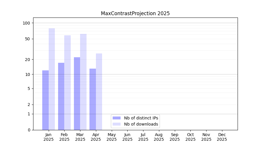 Number of downloads for software package MaxContrastProjection, year by year, from 2025 back to 2014 (years with no downloads are omitted):