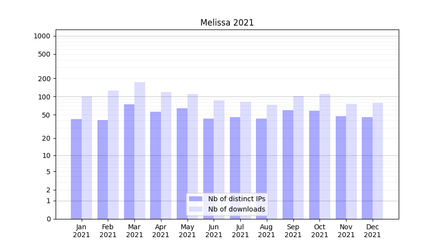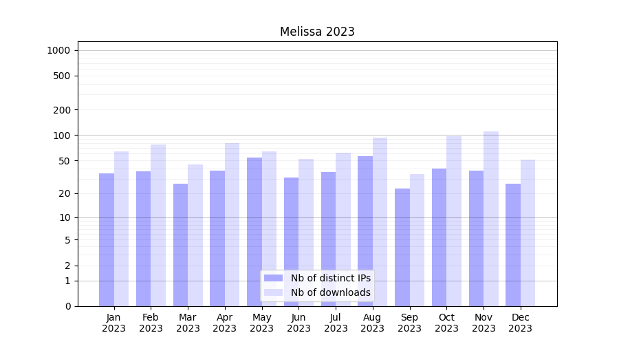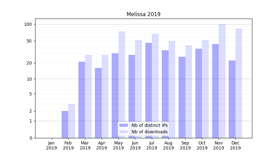 Number of downloads for software package Melissa, year by year, from 2025 back to 2014 (years with no downloads are omitted):
