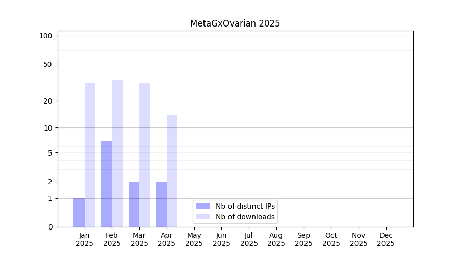 Number of downloads for software package MetaGxOvarian, year by year, from 2025 back to 2014 (years with no downloads are omitted):
