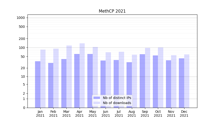 Number of downloads for software package MethCP, year by year, from 2025 back to 2014 (years with no downloads are omitted):