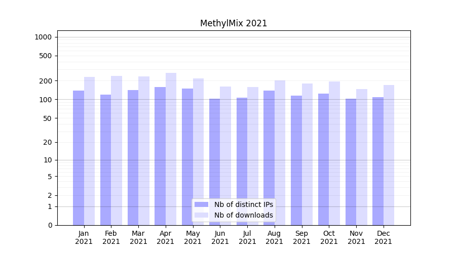 Number of downloads for software package MethylMix, year by year, from 2025 back to 2014 (years with no downloads are omitted):