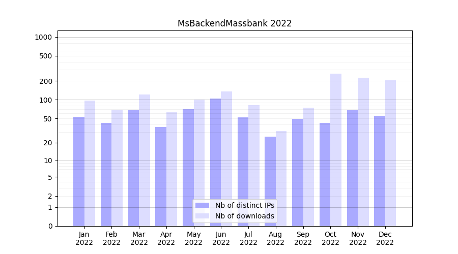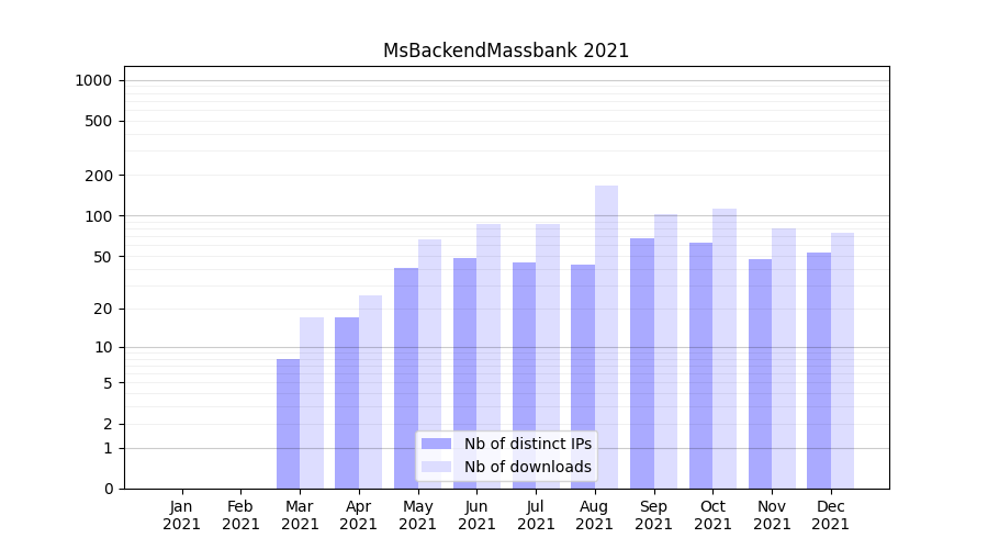 Number of downloads for software package MsBackendMassbank, year by year, from 2025 back to 2014 (years with no downloads are omitted):