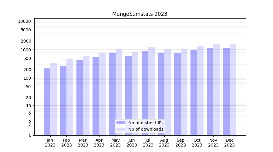 Number of downloads for software package MungeSumstats, year by year, from 2025 back to 2014 (years with no downloads are omitted):