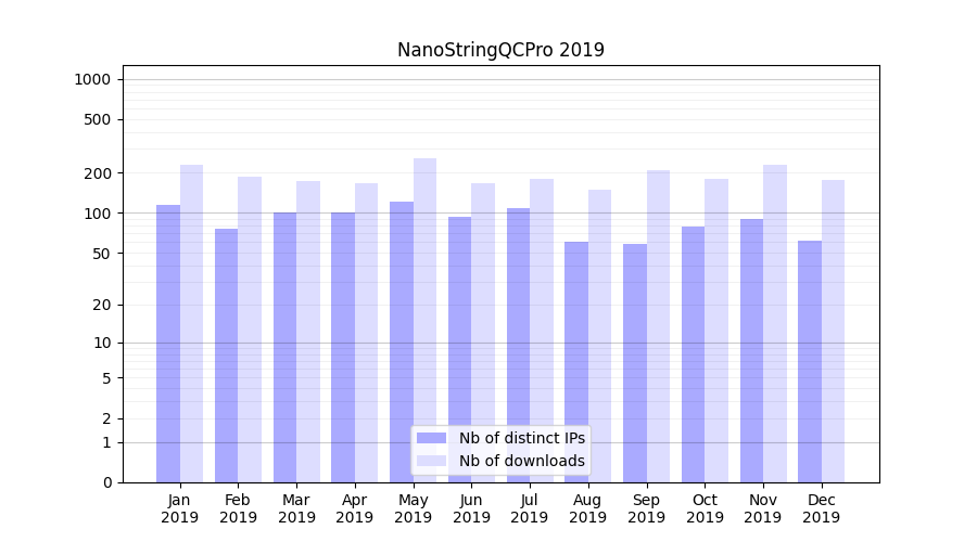Number of downloads for software package NanoStringQCPro, year by year, from 2025 back to 2014 (years with no downloads are omitted):
