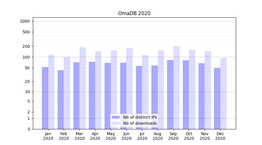 Number of downloads for software package OmaDB, year by year, from 2025 back to 2014 (years with no downloads are omitted):