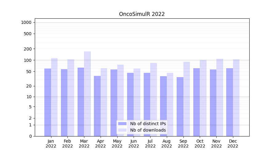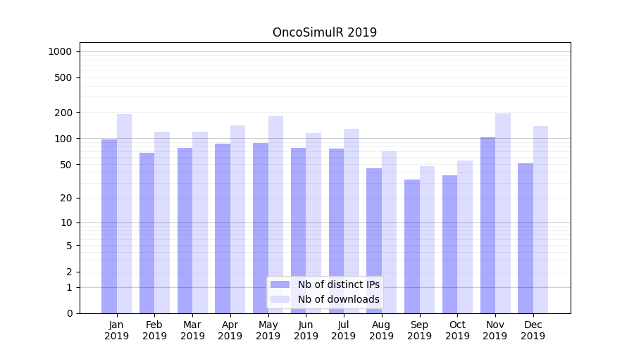Number of downloads for software package OncoSimulR, year by year, from 2025 back to 2014 (years with no downloads are omitted):