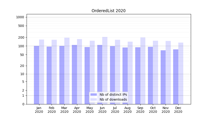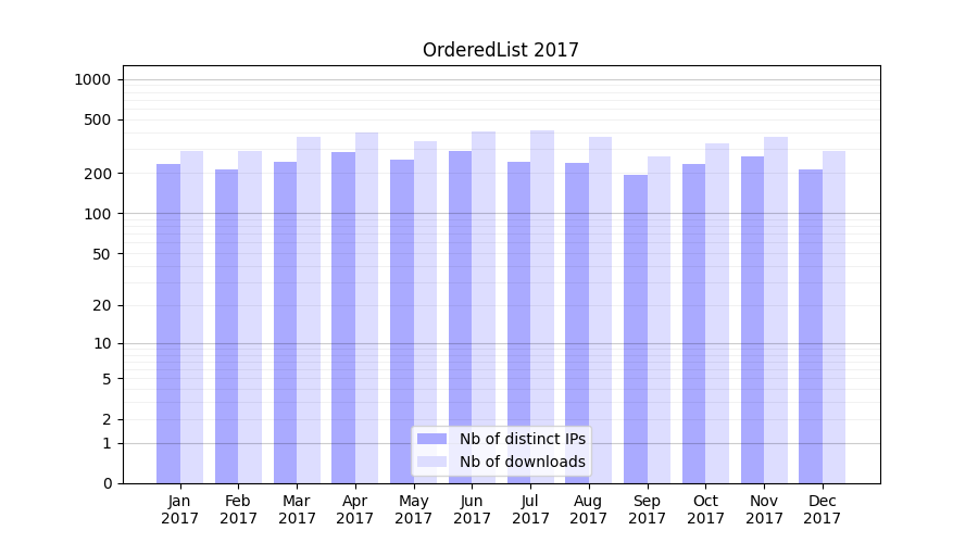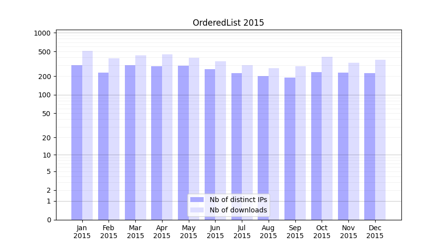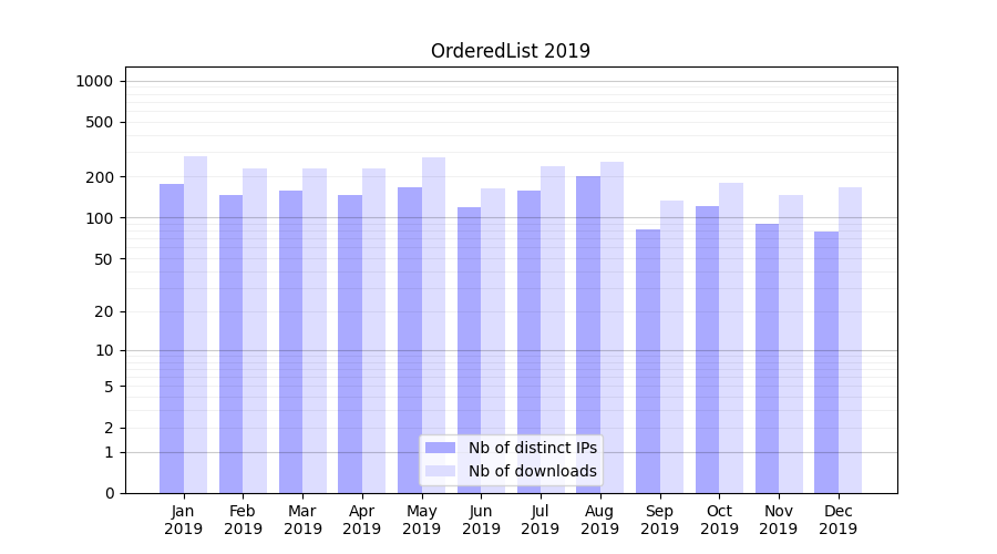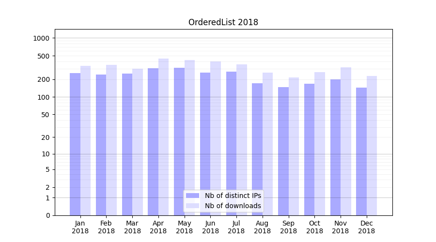 Number of downloads for software package OrderedList, year by year, from 2025 back to 2014 (years with no downloads are omitted):