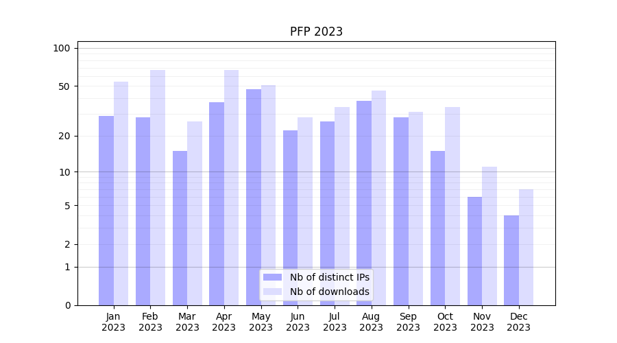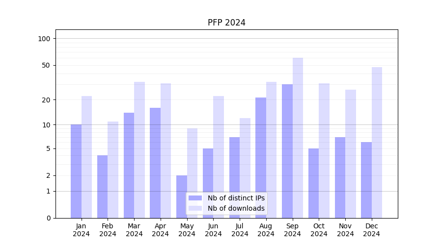 Number of downloads for software package PFP, year by year, from 2025 back to 2014 (years with no downloads are omitted):