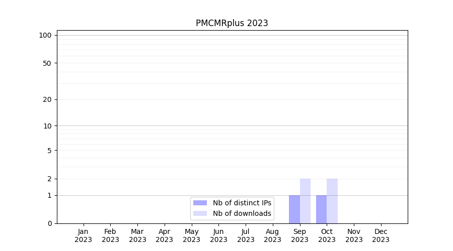 Number of downloads for software package PMCMRplus, year by year, from 2025 back to 2014 (years with no downloads are omitted):
