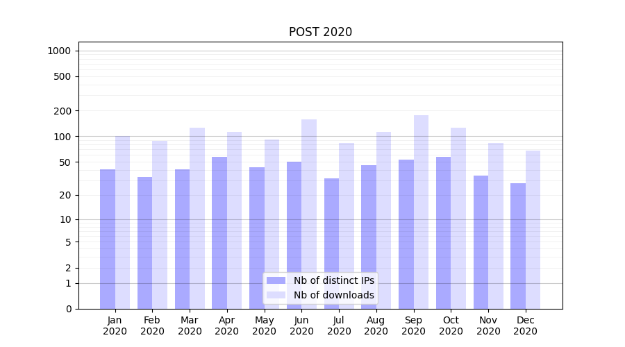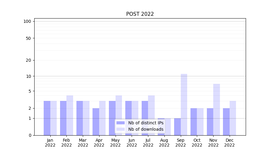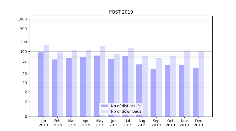 Number of downloads for software package POST, year by year, from 2025 back to 2014 (years with no downloads are omitted):